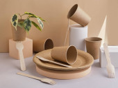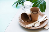 Jednorazowe kubki papierowe, słomki, łyżki i talerze ustawione na pastelowym zielonym tle. Koncepcja zero odpadów. Widok z góry