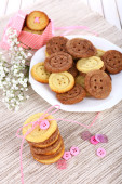 Zdjęcie "Cookies cukru w kształt przycisków na stole" może być wykorzystywane do celów osobistych i komercyjnych zgodnie z warunkami zakupionej licencji Royalty-free. Obraz jest dostępny do pobrania w jakości wysokiej rozdzielczości do 5760x3840.