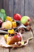strudel jabłkowy smaczne na papierową serwetkę, na tle drewniane