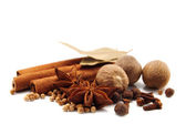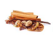 Tradycyjne przyprawy świąteczne - kije cynamonowe, anyż gwiazdowy, goździki, gałka muszkatołowa i kardamonowe strąki izolowane na białym tle.