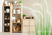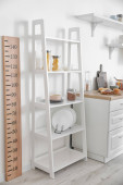 Półki z przyborami kuchennymi i stadiometrem w pobliżu ściany świetlnej