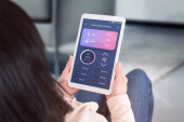 Kobieta z telefonem komórkowym za pomocą aplikacji inteligentnego domu bezpieczeństwa, zbliżenie