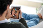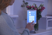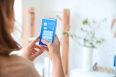 Kobieta z telefonem komórkowym za pomocą aplikacji inteligentnego domu bezpieczeństwa