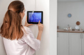 Kobieta korzystająca z panelu sterowania inteligentnego domu