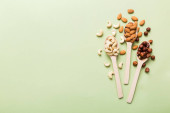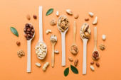 List E, różne zdrowe orzechy i kapsułki oleju rybnego na tle koloru
