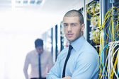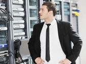 młody to engeneer biznesmen z cienki nowoczesny laptop aluminiowy w serwerowni sieci