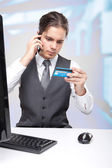zakupy online - młody kobieta siedzi z komputera przenośnego i karty kredytowej w dłoni.