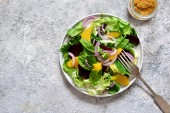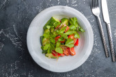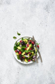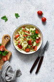 Klasyczna sałatka warzywna. Sałatka z kapustą, ogórkami i pomidorami z sokiem cytrynowym na konkretnym tle. Widok z góry.