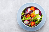 Zdjęcie "Sałatka z mieszanką zieleni na szarym tle. Zdrowa sałatka warzywna z pomidorami wiśniowymi, rzodkiewką i sałatką. Przestrzeń kopiowania" może być wykorzystywane do celów osobistych i komercyjnych zgodnie z warunkami zakupionej licencji Royalty-free. Obraz jest dostępny do pobrania w jakości wysokiej rozdzielczości do 5760x3840.