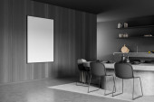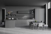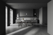 Zdjęcie "Szary zestaw kuchenny z betonowym stołem, drewniane czarne krzesła na betonowej podłodze. Minimalistyczne wnętrze z zestawem kuchennym i stojakiem z książkami. Kopiuj pustą ścianę, renderowanie 3D" może być wykorzystywane do celów osobistych i komercyjnych zgodnie z warunkami zakupionej licencji Royalty-free. Obraz jest dostępny do pobrania w jakości wysokiej rozdzielczości do 5760x3840.