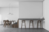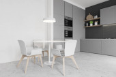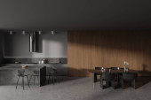 Szary zestaw kuchenny z betonowym stołem, drewniane czarne krzesła na betonowej podłodze. Minimalistyczne wnętrze z zestawem kuchennym i stojakiem z książkami. Kopiuj pustą ścianę, renderowanie 3D