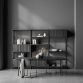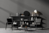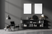 Zdjęcie "Szary salon, studia lub wnętrze biblioteki domowej. Betonowa podłoga, klasyczne półki z okrągłym lustrem stojącym na niej, fotel i okrągły stolik kawowy. Pionowa ramka na plakat. 3d renderowanie" może być wykorzystywane do celów osobistych i komercyjnych zgodnie z warunkami zakupionej licencji Royalty-free. Obraz jest dostępny do pobrania w jakości wysokiej rozdzielczości do 5760x3840.