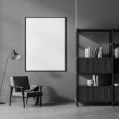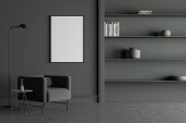 Szary salon, studia lub wnętrze biblioteki domowej. Betonowa podłoga, klasyczne półki z okrągłym lustrem stojącym na niej, fotel i okrągły stolik kawowy. Pionowa ramka na plakat. 3d renderowanie