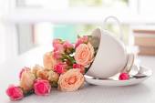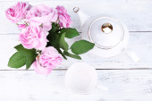śniadanie herbatę z czajnik świeże ogród róż na drewniane tła kolor
