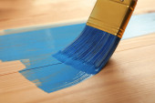 Robotnik nakładający niebieską farbę na drewnianą powierzchnię, zbliżenie. Miejsce na tekst