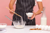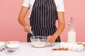 Zdjęcie "Przycięty obraz kobiety cukiernik przesiewa mąkę do robienia domowego ciasta, pani w fartuchu, trzyma sito w rękach, otoczony składnikami piekarniczymi. Kryty studio strzał izolowany na różowym tle" może być wykorzystywane do celów osobistych i komercyjnych zgodnie z warunkami zakupionej licencji Royalty-free. Obraz jest dostępny do pobrania w jakości wysokiej rozdzielczości do 5760x3840.