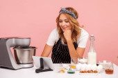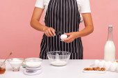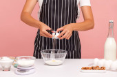 Przycięty obraz kobiety cukiernik przesiewa mąkę do robienia domowego ciasta, pani w fartuchu, trzyma sito w rękach, otoczony składnikami piekarniczymi. Kryty studio strzał izolowany na różowym tle