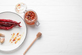 Deska z miodem i przyprawami na jasnym drewnianym tle