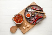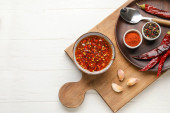 Deska z miodem i przyprawami na jasnym drewnianym tle
