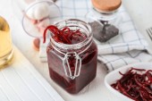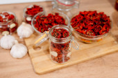 Słoik gorącego miodu i suchej papryki chili na drewnianym stole