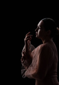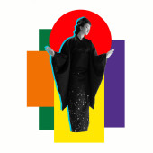 Portret młodej, pięknej Japonki, kobiety w narodowym stroju kimono pozującej na ciemnoniebieskim tle w neonie.