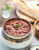 świeżo wykonane powoli gotowane chili con carne w dużym garnku gotowania rodziny, rozmyte tło skopiować przestrzeń góry i dołu