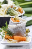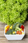 zdrowe śniadanie: Sałatka z warzyw i sosem śmietanowym na karcie drewniane