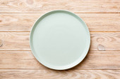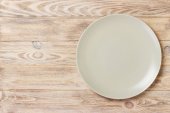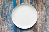 Głodny człowiek czeka na jego posiłek nad pusty talerz drewniany stół
