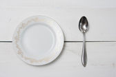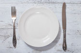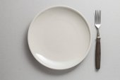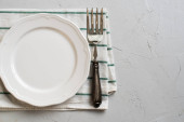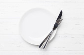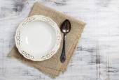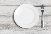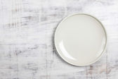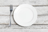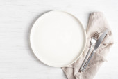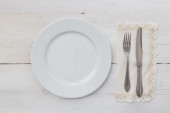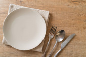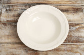 Widok z góry pusty talerz na rustykalnym drewnianym stole
