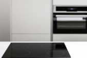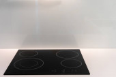 Stan czarny ceramiczny indukcyjny blat pieca z wysuwanym urządzeniem wydechowym na czysty blat z białą powierzchnią, wygodna nowoczesna technologia kuchnia bez nikogo na zdjęciu, zbliżenie