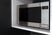 Duża szafa z białą kuchnią z wbudowanym czarnym metalowym piekarnikiem elektrycznym ze szklanymi drzwiami, nowoczesną, wygodną technologią o prostym designie. Nowe urządzenia kuchenne bez nikogo w zasięgu wzroku