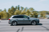 Ukraina, Kijów - 16 maja 2021 r.: Jasnoniebieski samochód Audi Q7 poruszający się po ulicy. Artykuł