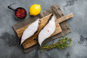 Surowy zestaw steków rybnych halibuta świeżego, ze składnikami i ziołami rozmarynu, na czarnym ciemnym kamiennym tle stołu, widok z góry płaski leżak