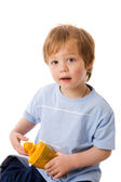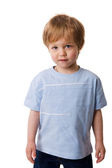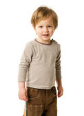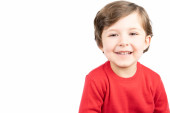 szczęśliwy chłopiec w trzy lata wieku śmiejąc się na białym tle