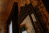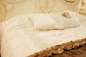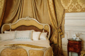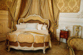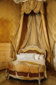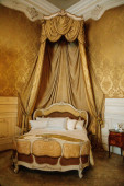 Wnętrze zamku, sypialnia, beżowe i białe kolory, barokowy klasycyzm rzeźbione drewniane meble, łóżko baldachimowe, wkłady tkaninowe, frędzle i frędzle, renesansowy zamek Opocno, Republika Czeska, 12 czerwca 2021