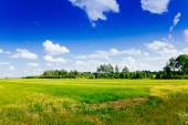 jęczmienia znajdującego się w rolnictwie i pochmurne niebo niebieskie
