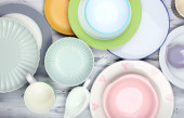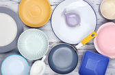 różne naczynia na drewniane tła