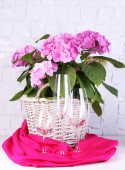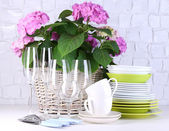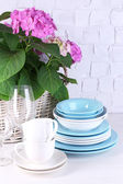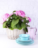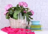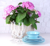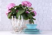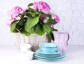 Kwitnący hortensji i naczynia na stół na tle szarej ścianie