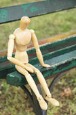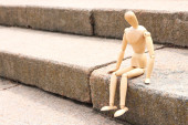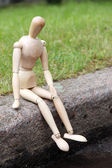 poza drewnianych lalek siedzi na schody, na zewnątrz
