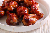 Deska z pieczonymi skrzydełkami kurczaka na tle koloru