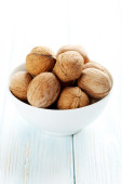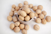 Orzechy włoskie w łupinach wlewa się do filiżanki na jasnobarwnym drewnianym