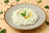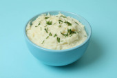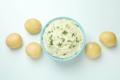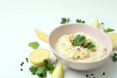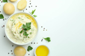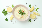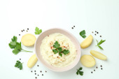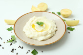 Talerz tłuczonych ziemniaków i składników na białym tle