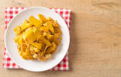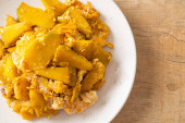 banany z grilla z sosem karmelowym kokosowym na talerzu