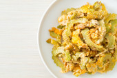 Zdjęcie "Wymieszać smażoną gorzką dynię z jajkiem na talerzu" może być wykorzystywane do celów osobistych i komercyjnych zgodnie z warunkami zakupionej licencji Royalty-free. Obraz jest dostępny do pobrania w jakości wysokiej rozdzielczości do 5760x3840.