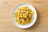 Wymieszać smażoną gorzką dynię z jajkiem na talerzu