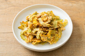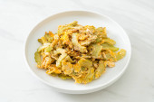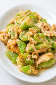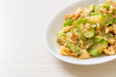 Wymieszać smażoną gorzką dynię z jajkiem na talerzu