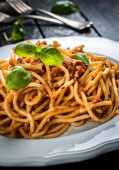 Spaghetti alla puttanesca - włoskie danie z makaronem z pomidorami, czarnymi oliwkami, kaparami, anchois i pietruszką. Widok z góry, płaski