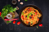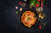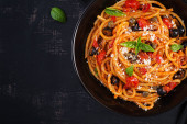 Spaghetti alla puttanesca - włoskie danie z makaronem z pomidorami, czarnymi oliwkami, kaparami, anchois i bazylią. Widok z góry, płaski