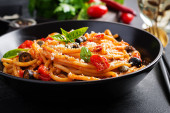 Zdjęcie "Spaghetti alla puttanesca - włoskie danie z makaronem z pomidorami, czarnymi oliwkami, kaparami, anchois i basi" może być wykorzystywane do celów osobistych i komercyjnych zgodnie z warunkami zakupionej licencji Royalty-free. Obraz jest dostępny do pobrania w jakości wysokiej rozdzielczości do 5760x3840.