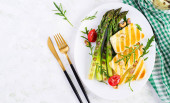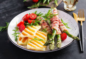 Grillowana sałatka z serem halloumi z pomidorami i szparagami na talerzu na ciemnym tle. Zdrowe wegetariańskie jedzenie. Widok z góry, powyżej